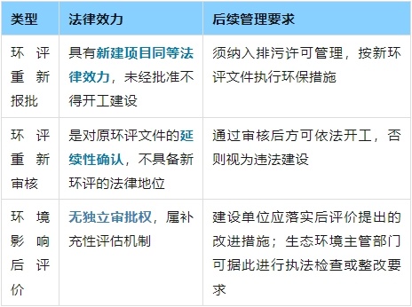 在建設(shè)項(xiàng)目環(huán)境影響評(píng)價(jià)管理過(guò)程中,環(huán)評(píng)重新報(bào)批、重新審核和環(huán)境影響后評(píng)價(jià)是三種不同的制度安排,它們?cè)诙x、適用情形、審批流程和要求、以及法律效力和后續(xù)管理要求方面存在顯著差異。以下將結(jié)合相關(guān)法規(guī)文件內(nèi)容逐一進(jìn)行比較分析: